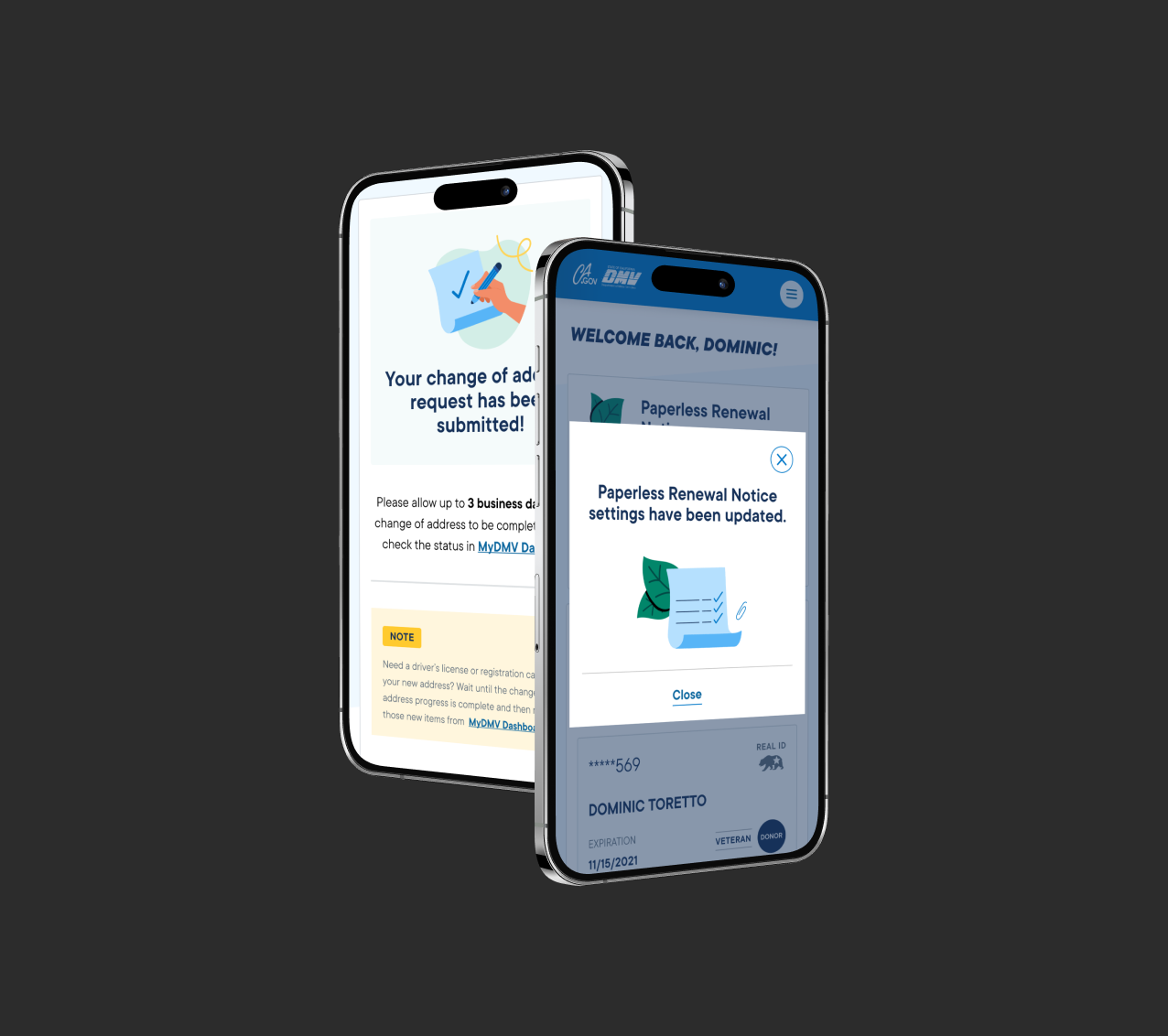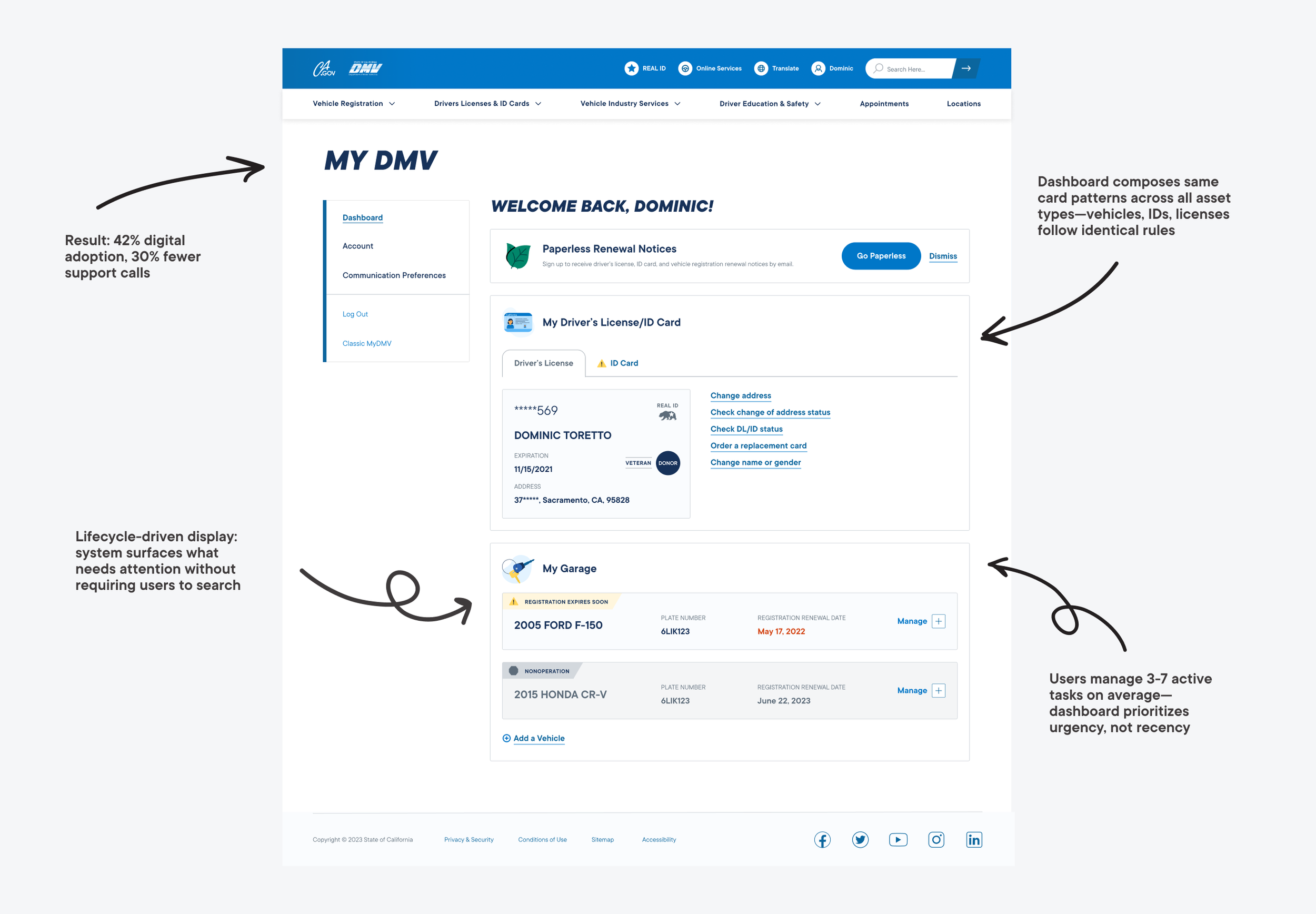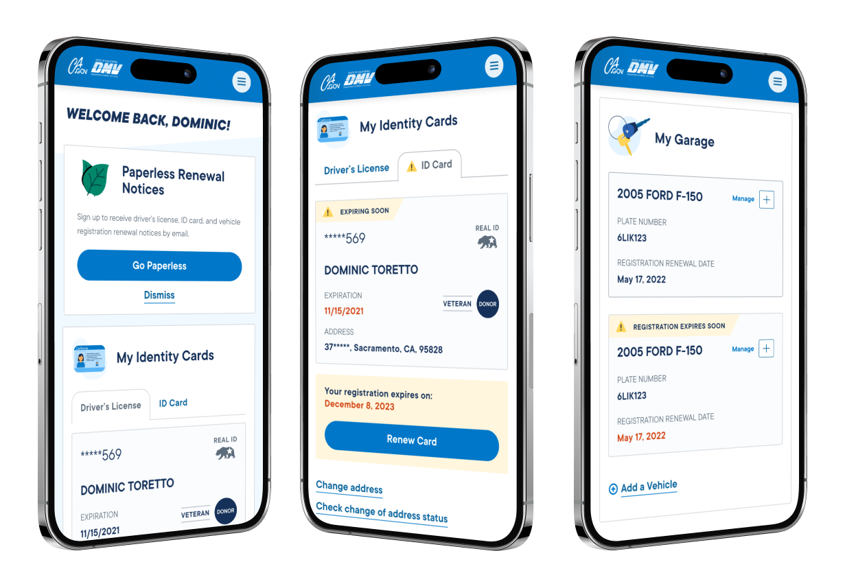 I unified 15+ disconnected DMV services into a single platform used by millions of California drivers; the work was expressed through a cohesive dashboard experience and the definition of shared patterns for identity, lifecycle status, and task completion, modernizing the underlying design system for scale and long-term evolution.