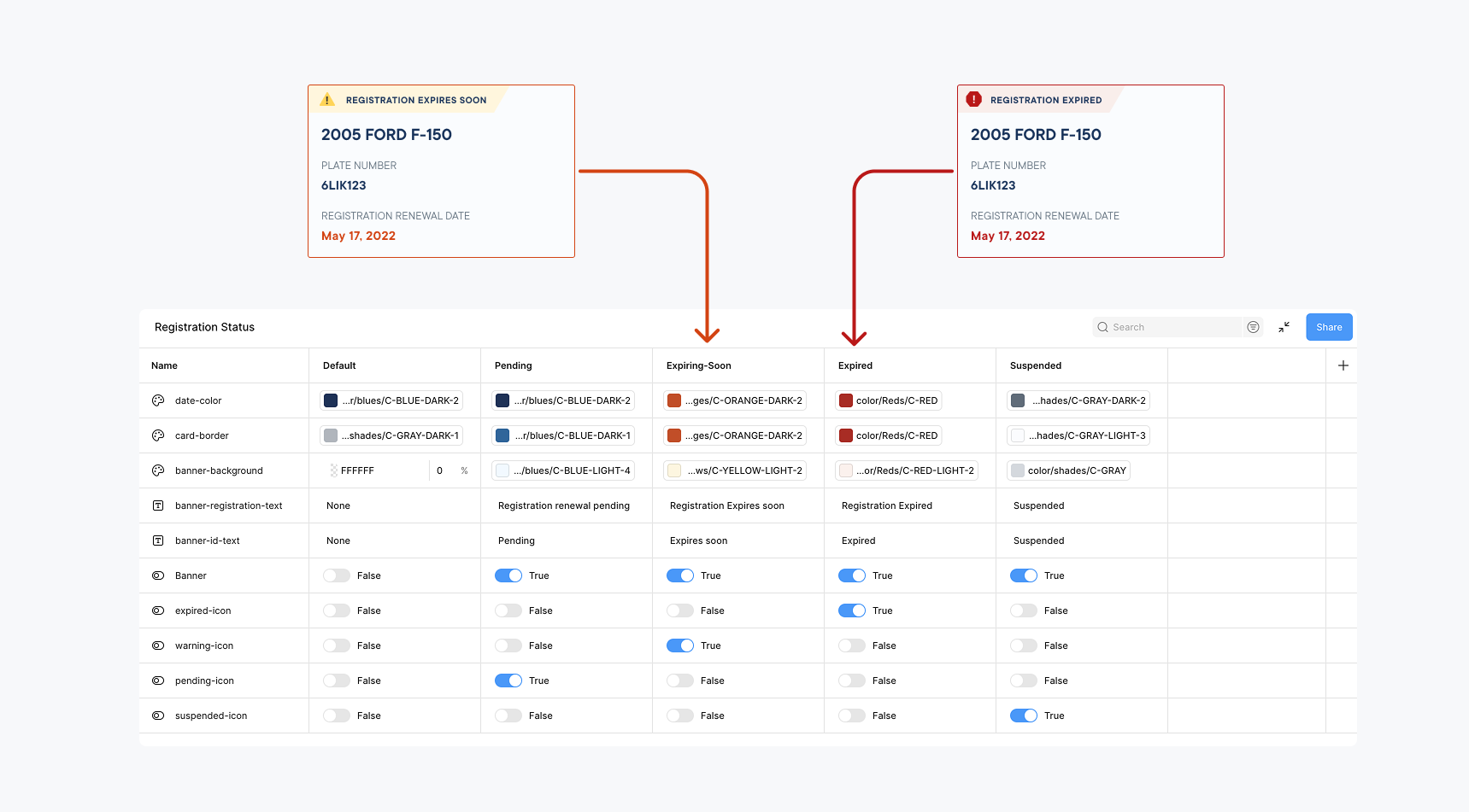 Status logic extended beyond the Garage Card, so I defined a shared status model that could be applied across asset types. Alert copy and visual treatments were encoded as tokens, allowing the same states to scale consistently across components while remaining easy to extend over time.