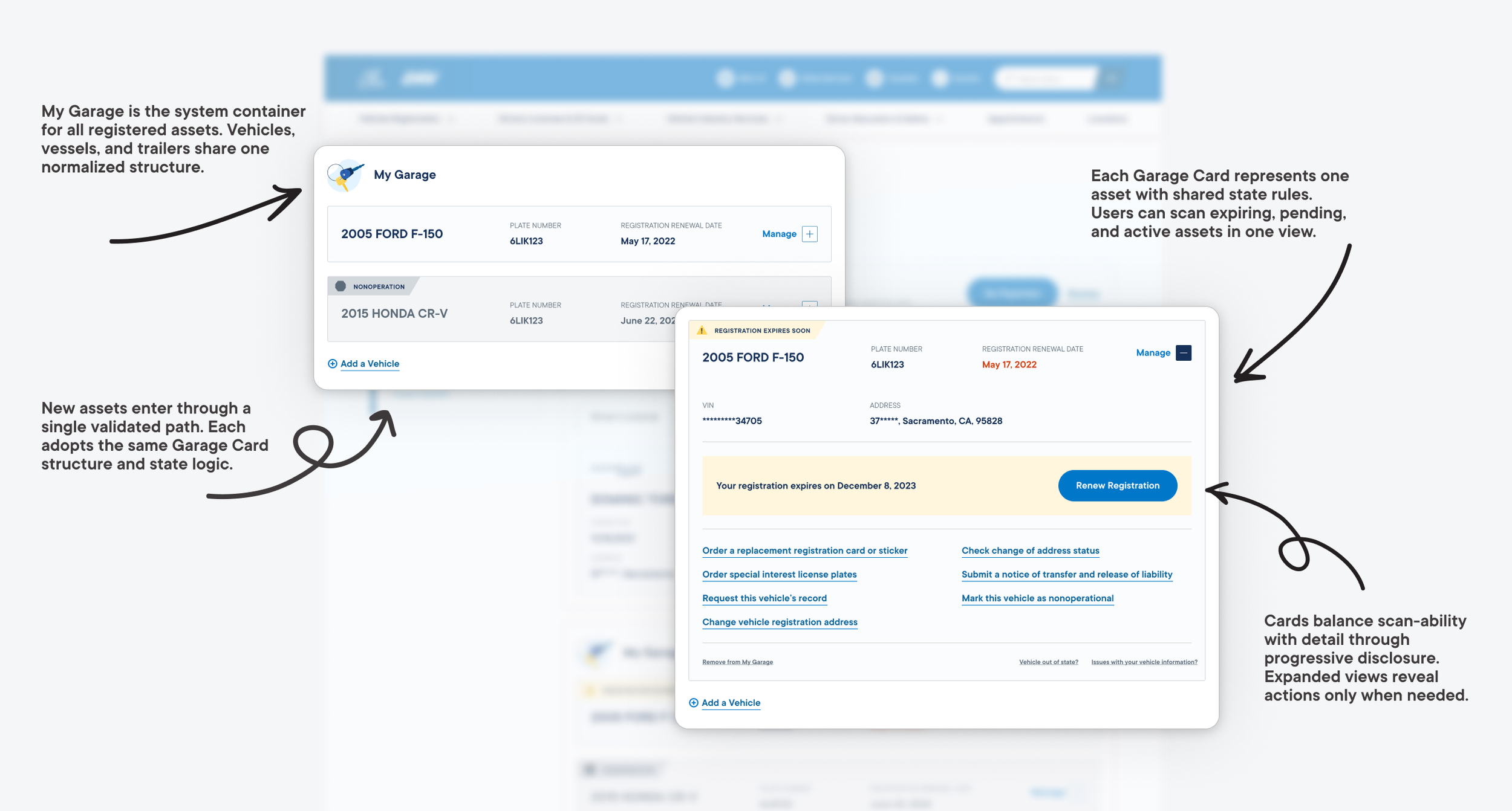 MyDMV was designed around single, linear transactions, when in reality users were actually managing portfolios of assets—IDs, licenses, and multiple vehicles—each with its own status, urgency, and next action. Without shared patterns for asset collections or lifecycle state, users struggled to understand what was complete, what was pending, and what required attention.