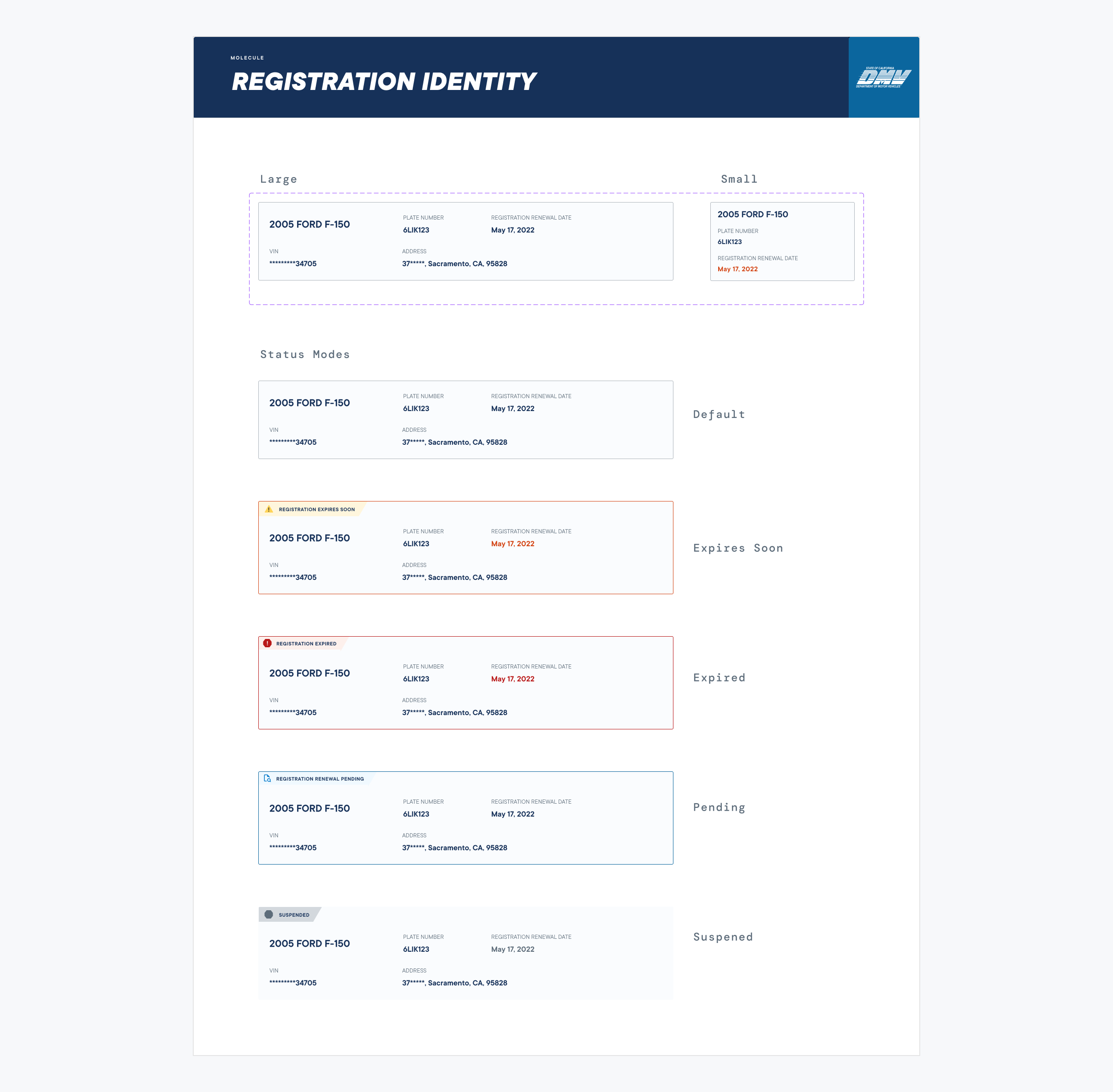 This composite approach allows individual elements, such as registration identity, status banners, CTA surfaces, and contextual actions, to be reused across Garage surfaces while preserving consistent meaning and interaction patterns.