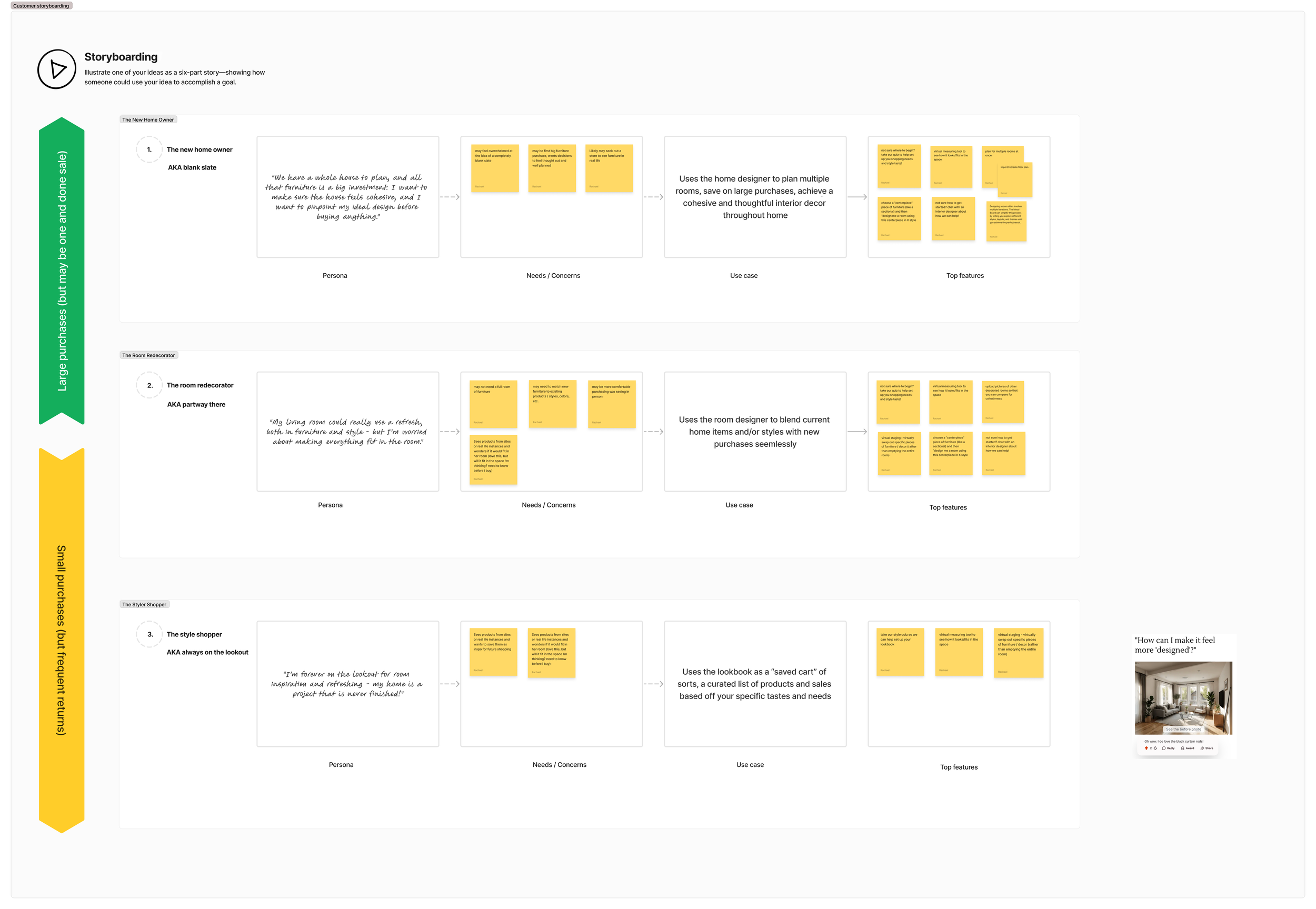 This storyboard illustrates three distinct customer personas and how they engage with the home design experience, each with unique needs, concerns, and goals. The framework maps their journey from initial mindset to the features that best support them.