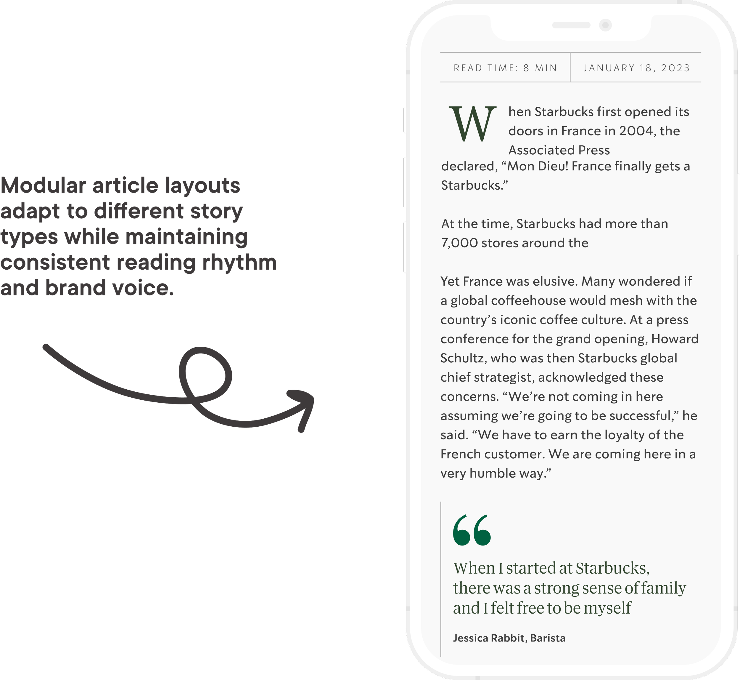Starbucks' editorial platform was facing mounting complexity as the brand expanded globally. Editors struggled with inconsistent layouts, cumbersome workflows, and limited scalability, making it difficult to maintain brand voice while serving diverse market needs.